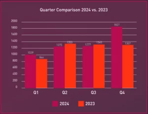 After a slow start, attacks surged in Q2 and Q4, with 1,827 incidents (33% of the year’s total). Law enforcement actions against major groups like LockBit led to fragmentation, increased competition, and the rise of smaller gangs. The number of active ransomware groups jumped 40%, from 68 in 2023 to 95 in 2024.